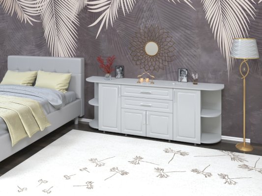 Комод из коллекции системной мебели Валенсия. Эта мебель отличается элегантным стилем и позволяет создавать классические предметы интерьера для гостиной, столовой, спальни или офиса. У модели четыре распашные дверцы с внутренними полками, радиусные полки с двух сторон и два практичных ящика.