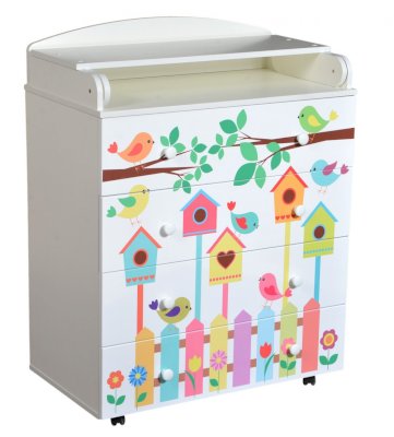 Пеленальный комод 800/4 Lilu 3 отличается привлекательным дизайном с использованием тематических детских принтов. В конструкции изделия предусмотрены 4 маленьких передвижных колеса, несколько вместительных ящичков на шариковых направляющих и откидывающаяся пеленальная столешница. Детский пеленальный комод, декорированный красочным рисунком, вмещает в себя постельные принадлежности, средства гигиены, распашонки, подгузники, игрушки, ползунки и другие личные вещи ребенка. Гладкая столешница идеально подходит для пеленания ребенка, а колесики позволяют быстро перемещать комод.