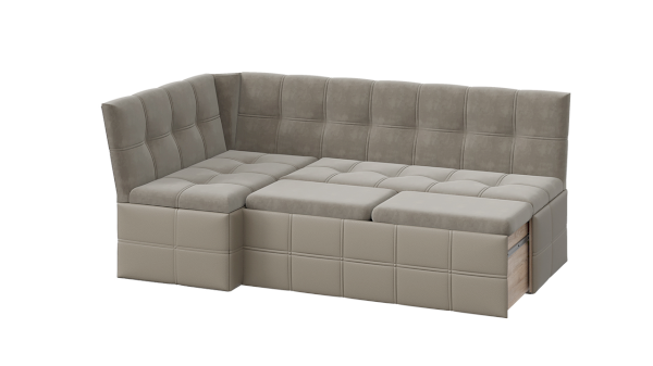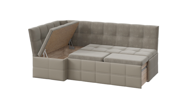 Новинка является многофункциональным предметом мебели, ведь в обычном виде скамья угловая поможет удобно разместиться за обеденным столом, а механизм трансформации превращает его в полноценное спальное место для гостей, оставшихся ночевать. Для раскладывания необходимо выложить подушки, которые входят в комплект, на выдвигаемую часть скамьи. Модель позволит Вам отказаться от большого количества подвесных полок и дополнительных модулей за счёт того, что в ней имеется вместительное место для хранения под сидением.