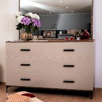 Широкий вместительный комод с шестью ящиками – функциональный модуль, который подходит не только для хранения вещей, но и для размещения телевизора. Столешница и основание комода подчеркнуты контрастным декором Дуб Табачный. Фигурные металлические опоры и ручки из массива органично дополняют модуль.