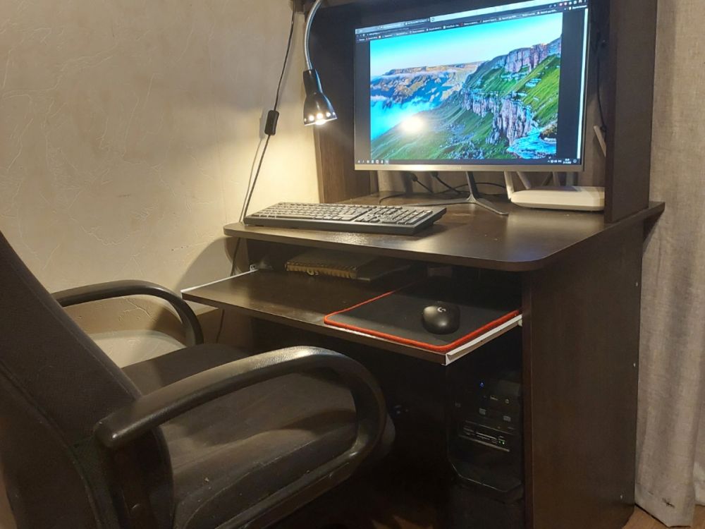 Получился компактный уголок на даче для непродолжительной работы за компом. Уместилось все, что нужно, На полку можно повесить лампочку на прищепке Переживала, что наши длинные ноги будут упираться в нижнюю полку. Оказалось зря переживала, на пределе, но не упираются :).