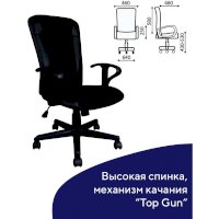 Кресло оснащено механизмом качания «топ-ган» с регулировкой под вес пользователя и возможностью фиксации спинки в рабочем положении.