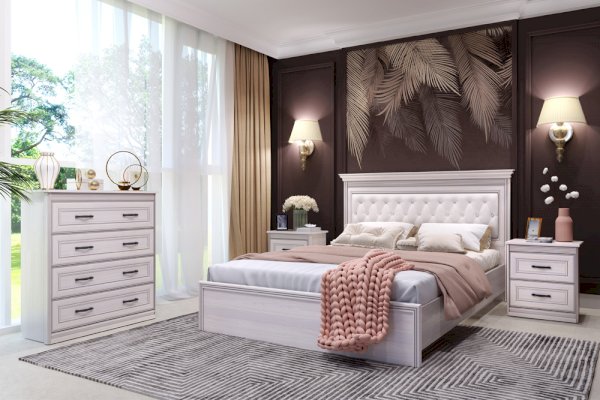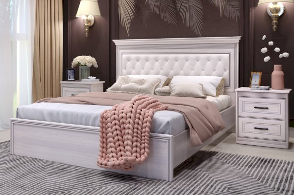 Нарядный образ классической кровати обеспечивают рифленые объёмные профили МДФ и каретная стяжка мягкой спинки в изголовье кровати.