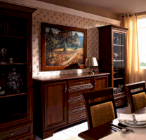 Центральное отделение сверху оснащено двумя выдвижными ящиками, а снизу – двойной нишей с полками на распашных дверцах.