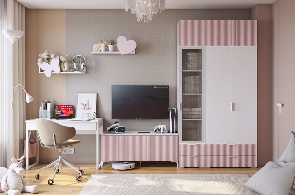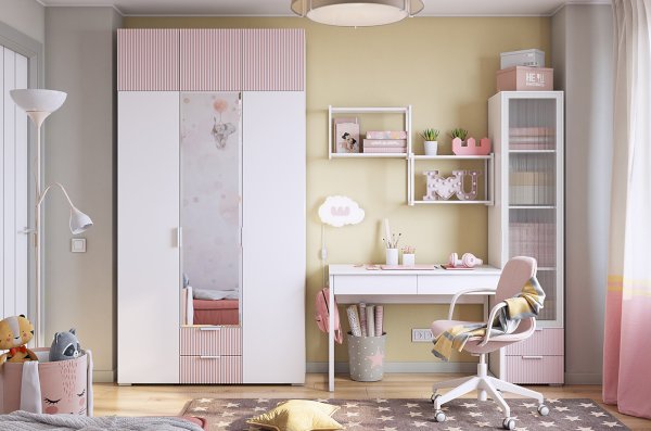 Корпус изготовлен из прочного и долговечного ЛДСП белого дерева, а фасады выполнены из МДФ с пудрово-розовой эмалью. Вертикальные полосы на фасаде придают шкафу особый шарм и стиль.