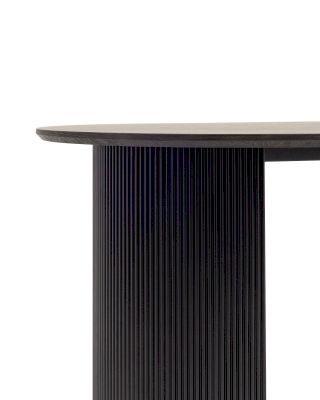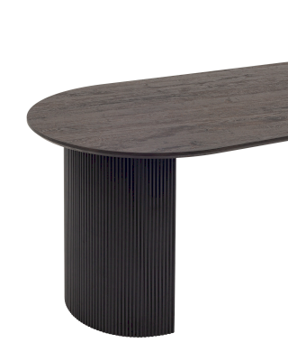 Столешница выполнена из прочного и долговечного МДФ. Темная поверхность столешницы гармонично сочетается с массивными ножками черного цвета. Простая овальная форма стола позволит легко вписать его в современный интерьер, стол украсит кухню, гостиную или современное кафе, ресторан. Опорные плиссированные ножки в лаконичном дизайне надёжно удерживают всю конструкцию и дополняют монолитный образ.