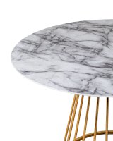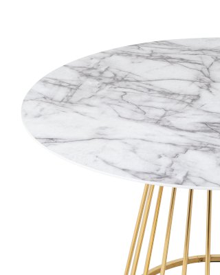 Стильный стол с металлическим основанием. Круглая столешница с рисунком белого мрамора выполнена из МДФ - прочного, экологически безопасного материала, который устойчив к перепадам температур и повышенной влажности. Поверхность столешницы декорирована рисунком белого мрамора, который идеально сочетается с металлическим основанием в золотом цвете. Защитные подпятники в основании предотвращают порчу напольного покрытия.