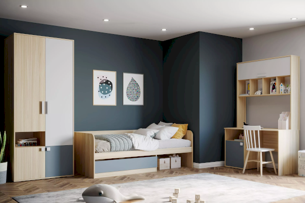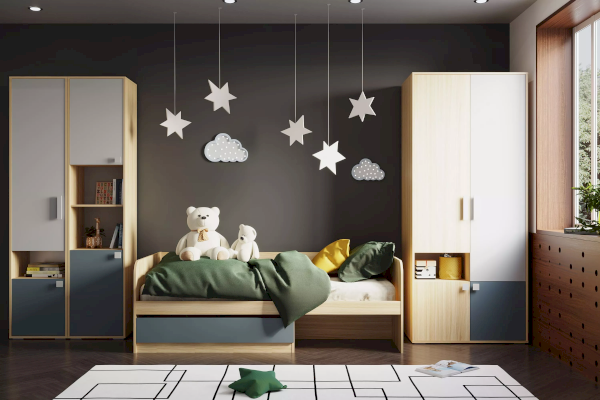 Шкаф для одежды из новой коллекции детской мебели Элиот выполнен в нейтральных оттенках песочного, белого и контрастного маренго – цвета темной морской волны, которые отлично подойдут в комнату как девочки, так и мальчика, сделав ее стильной и современной.