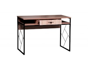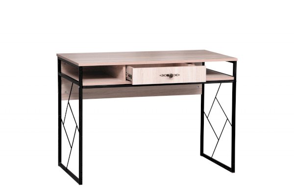 Опоры и декоративные элементы сделаны из металла. Столешница выполнена из ЛДСП. Геометрические элементы по бокам придают строгому письменному столу стиль и красоту. Плюс к этому они еще и функциональны – через них легко можно пропустить любой провод, что невозможно при сплошных боковых панелях. Металлическая основа имеет специальное укрепление, которое позволяет выдержать нагрузку до 80 кг. Таким образом, стол без труда выдержит всю технику, необходимую для учебы и для работы. Габариты столешницы позволяют разместить на своей площади большой монитор, принтер и оставить место для работы с бумагами и учебниками. Выдвижной ящик снабжен шариковыми направляющими, что обеспечивает плавное и бесшумное выдвижение. Справа и слева от выдвижного ящика есть две удобные ниши, в которые можно убрать то, что не предназначено для всеобщего обозрения.