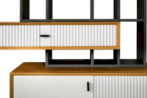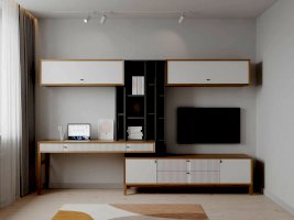 • На тумбу ТВ опирается вертикальный открытый стеллаж с полками, в который установлен стол-консоль с опорными ножками ППУ с одной стороны.