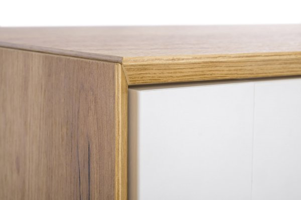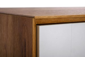 • В центре тумбы два выдвижных ящика на направляющих нижнего крепления неполного выдвижения с доводчиком. Слева и справа за распашными дверями ниши.