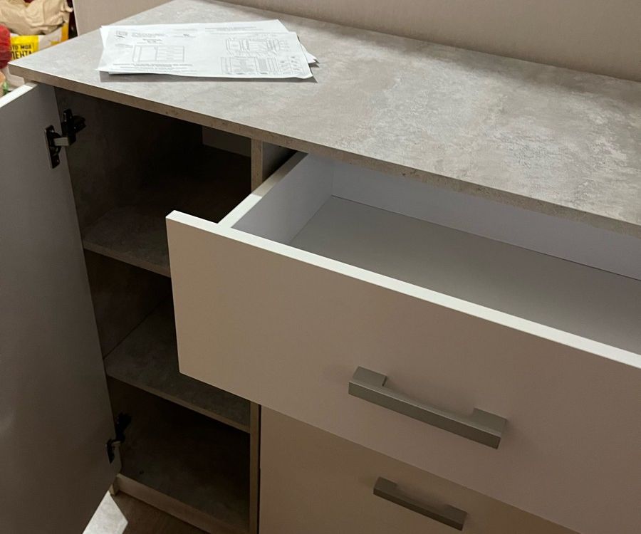 Выбирали комод по фото. Даже не ожидали, что комод окажется настолько качественным и красивым! Все детали без дефектов и сколов, что очень порадовало! Достаточно крепкая фурнитура, крепкие салазки. Приятно, что продавец очень внимательный и положил даже наклейки для того, чтобы закрыть место крепления! Однозначно рекомендую к покупке! Теперь хотим угловой шкаф и тумбу из этой же серии мебели, чтобы собрать комплект.