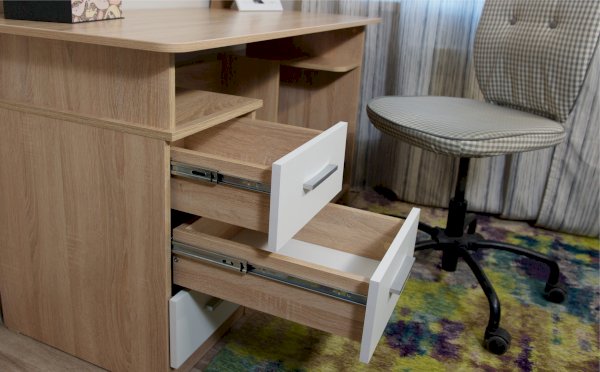 Стол письменный компьютерный – удобное рабочее место для студента, школьника, отличное решение для кабинета с интерьером в скандинавском стиле. На широкой столешнице легко поместится монитор, клавиатура и документы, а в ящиках поместятся все письменные принадлежности. Выделено место для системного блока. В столах системы Гарвард мягкие, удобные для опирающихся рук края, с кромкой в 2мм, а также, скруглённые углы столешницы. Корпус выполнен в теплом древесном цвете светлого дуба с приятной на ощупь фактурой, фасады - белые матовые. Нейтральные оттенки мебели позволяют легко вписаться уже в готовый интерьер.
