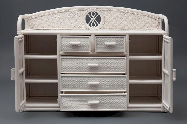 Великолепный высокий комод Secret De Maison из французской коллекции ANDREA, выполненный в колониальном стиле, прекрасно впишется в интерьер квартиры или загородного дома. При всей простоте исполнения, комод является довольно вместительным и функциональным предметом обстановки. Пять удобных выдвижных ящиков разного размера и два закрытых отделения с полками позволят хранить огромное количество предметов. Декоративная панель и боковые бортики сверху надежно защитят предметы от падения. Комод выполнен вручную из натурального ротанга с использованием нескольких видов традиционного индонезийского плетения. Натуральный ротанг, покрытый прозрачным матовым лаком, устойчивым к УФ-излучению, прочен, долговечен, способен выдерживать большую нагрузку, и будет радовать вас своим первоначальным видом долгие годы. Модель идеально сочетается с мебелью из коллекции ANDREA, поставляется в собранном виде.
