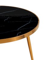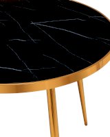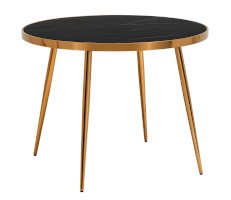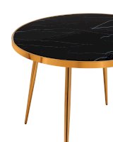Изящный обеденный стол для кухни. Круглая столешница с рисунком черного мрамора выполнена из закаленного стекла, которое обладает повышенной прочностью и стойкостью к перепадам температур, способно выдерживать большие нагрузки. Поверхность столешницы декорирована рисунком черного мрамора, который идеально сочетается со стальными ножками в золотом цвете. Защитные подпятники в основании предотвращают порчу напольного покрытия.