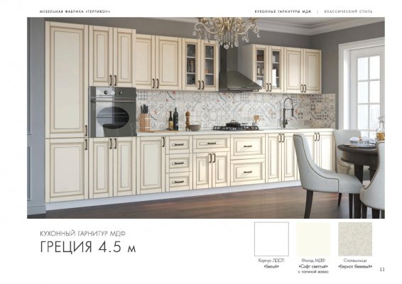 Специально для тех, кто отдает предпочтение классическому дизайну, создана кухня «Греция». Правильные пропорции, отделка естественных цветов и фактур, элегантное декорирование смотрятся беспроигрышно. Из элементов этой модульной системы удается собрать комплект для помещений различной площади и планировки. Готовый гарнитур может быть как угловым, так и прямолинейным.