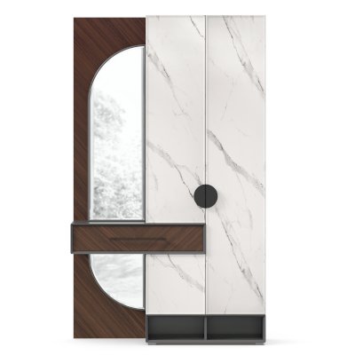 • Секция шкафа: вверху полка для шляп, под ней справа выдвижная штанга-вешалка для плечиков, слева вертикальная перегородка с двумя полками для мелких предметов, внизу ниша за одной распашной дверью