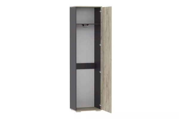 В отделении за распашной дверью имеется полка и выдвижная штанга для хранения предметов одежды на вешалках, а лаконичная ручка серого цвета подчеркивает стиль коллекции. Сборка шкафа универсальна – дверь может крепиться как на правую, так и на левую стороны. Дополните шкаф тумбой из одноименной коллекции, чтобы создать особо гармоничную атмосферу.