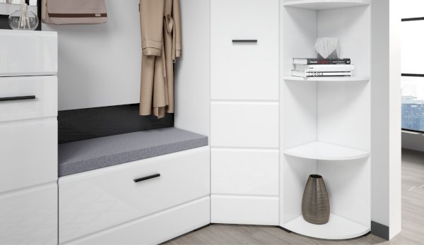 Угловой шкаф выполнен в современном стиле – сочетает в себе функциональность и эффектный внешний вид: строгая горизонтальная фрезеровка фасадов, ручки и задняя стенки контрастного черного цвета. Глянцевые белые фасады High Gloss из МДФ наполняют комнату светом, делают ее просторнее. Внутри предусмотрены секции для белья и отделение со штангой. Шкаф позволяет рационально использовать пространство и будет хорошо смотреться даже в небольшой комнате, служит связующим звеном для составления угловой системы хранения. Идеально компонуется со всеми модулями системы Йорк.