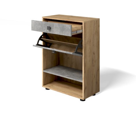 Узкая высокая обувница из набора модулей прихожей Мини-лайт включает ящик для средств ухода за обувью, обувницу с откидной крышкой и две полки под обувь. Не смотря на компактные размеры вместительна и функциональна.