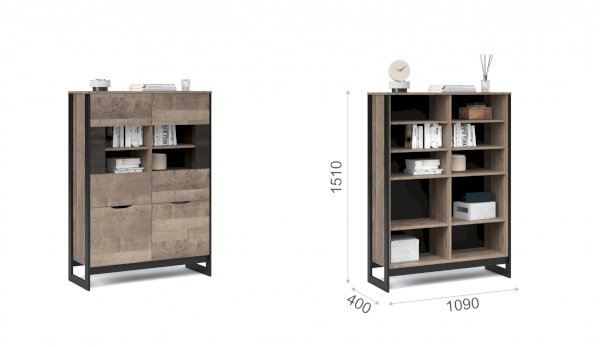Шкаф-витрина со стеклянным фасадом – современное решение для гостиной или прихожей в стилях лофт, сканди, эко-минимализм. За стеклом размещены полки для предметов интерьера или красивой посуды. Нижние отделения с глухими фасадами служат для хранения личных вещей. Отсутствие лицевой фурнитуры подчеркивает минимализм и геометрию модуля. Особенность дизайна – это сочетание реалистичных по цвету и тактильности трендовых декоров, которые соответствуют последним городским тенденциям. «Дуб Гранж» привлекает имитацией вручную обработанного дерева и выразительной зернистой текстурой, характерной формой досок. Стильный серый цвет «Железного камня» с металлическими разводами и новая текстура состаренной штукатурки в сочетании с гладкостью металла вносят индустриальный колорит. Оригинальные ножки-опоры из МДФ контрастного цвета придают изюминку, а светодиодная подсветка усилит впечатление от созданного интерьера.