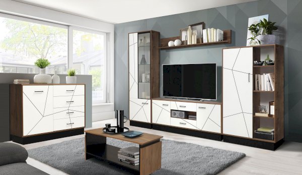Шкаф-пенал выглядит необычно. В нем всего одна дверца, которая визуально разделена на три части и смотрится как три отдельных элемента: две вертикальные дверцы – сплошная и стеклянная, и один нижний ящик. На самом же деле вы беретесь за ручку и… все три дверцы превращаются в одну и открываются одним движением. Ломаные линии на фасаде – визитная карточка коллекции. Будьте смелее – не бойтесь острых и тупых углов!
