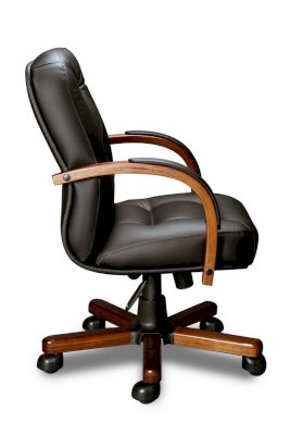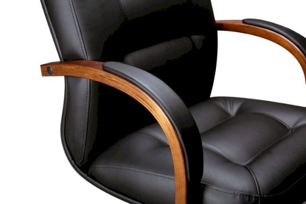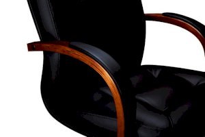 Кресло с низкой спинкой, с подлокотниками дугообразной не замкнутой формы с мягкими накладками обитыми в цвет кресла.
