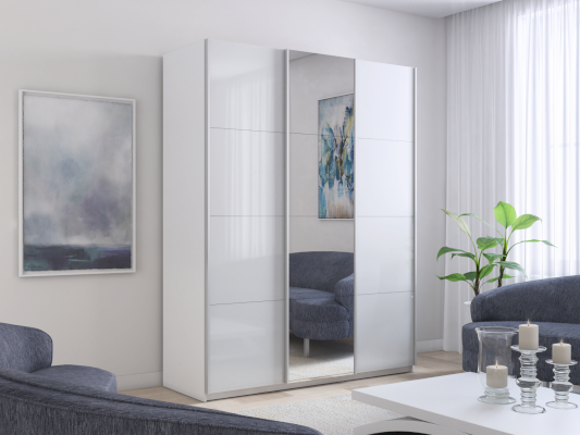Шкаф-купе 3-х дверный Прайм ДСП/Зеркало/ДСП 1800 мм Белый снег