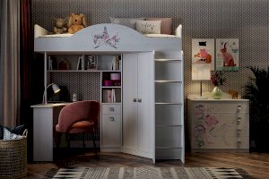 Состоит из: шкафа для одежды, стола, выдвижного ящика, шкафа с полкой, спального места, полок.