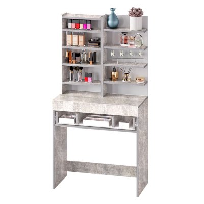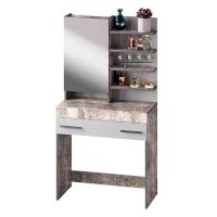Косметический стол из мебельной коллекции Инстайл – незаменимый атрибут для любой женщины! Разместить все необходимые бьюти-гаджеты, средства для ухода за лицом и волосами можно в данной модели. В столешницу встроен выдвижной ящик с отделениями для хранения различных мелочей или украшений. Туалетный стоик обладает большим количеством полок, часть из которых спрятаны за зеркальной дверцей, а часть является открытыми, чтобы предметы первой необходимости всегда были под рукой! Гармоничное сочетание белого и серого цвета позволит косметическому столу украсить любой интерьер.